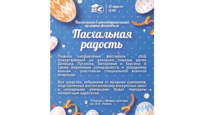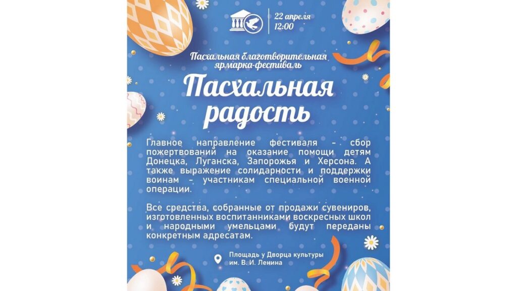 Скопинцев и гостей приглашают на благотворительную Пасхальную ярмарку. Она пройдет в Скопине в субботу, 22 апреля, в рамках Пасхальных торжеств «Светлая седмица». Ярмарку проводят отдел по работе с молодежью Скопинской епархии и управление культуры и туризма г. Скопина по благословению владыки Питирима.