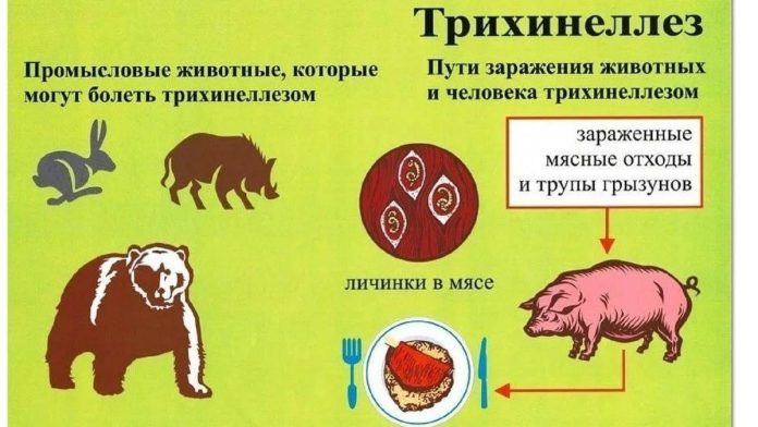 Животные заражаются при поедании необезвреженного трихинеллезного мяса. А человек – при употреблении в пищу сырых или недостаточно проваренных мясопродуктов от пораженных животных. Для того чтобы получить это заболевание, достаточно съесть 10–15 граммов зараженного мяса дикого или домашнего животного.
