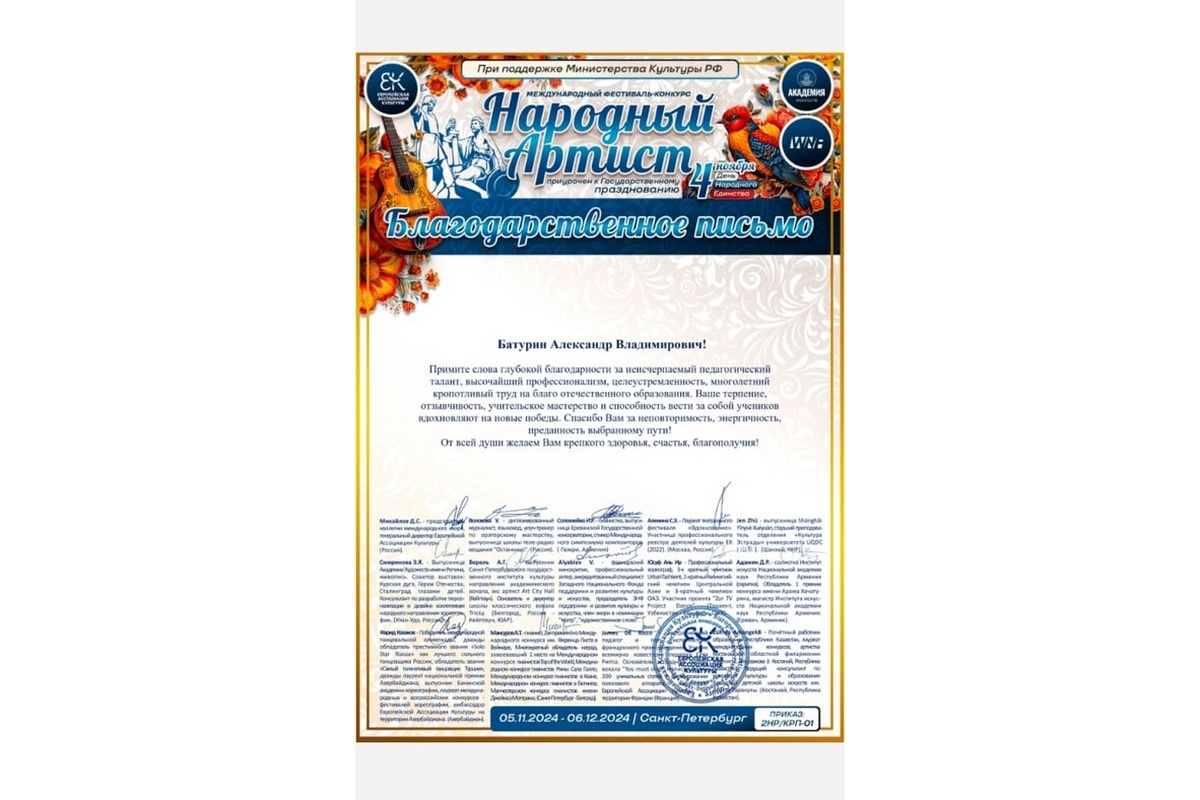 Казачий хор «Журавинка» представил на конкурс песню «Собирался казак на войну» в номинации «Вокальное искусство» и стал лауреатом I степени. Его руководитель Александр Батурин получил Благодарственное письмо от жюри конкурса.