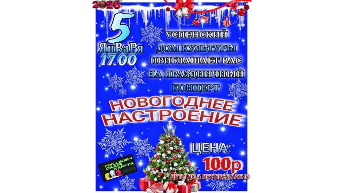 Скопинцев приглашают на праздник 1 января, 2025 Успенский Дом культуры Скопинского района приглашает на праздник. 5 января зрителей ждет концерт «Новогоднее настроение». Билеты можно приобрести в том числе и по Пушкинской карте. 0+.