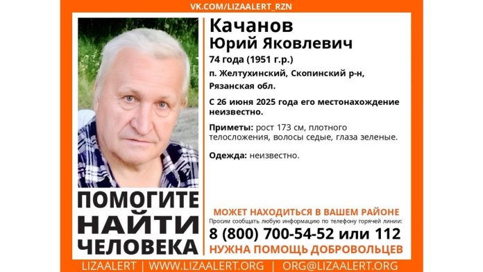 В Скопинском районе пропал Юрий Яковлевич Качанов. По информации поискового отряда «Лиза Алерт», 74-летний житель поселка Желтухинский пропал 26 июня и до настоящего времени его местонахождение неизвестно.