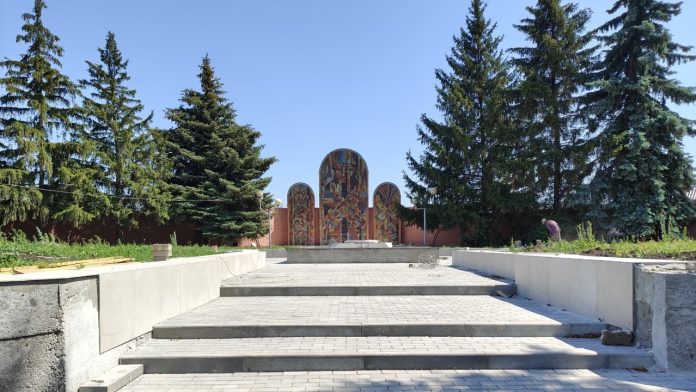 Подрядчики уже выложили тротуарной плиткой подход к чаше Вечного огня, сейчас плитку выкладывают на тротуарах с внешней части мемориала. Само основание чаши облицуют плиткой из черного гранита, а крупной плиткой в светлых тонах выложат боковые части всех модулей территории. Подрядчики работают в хорошем темпе. Работы по контракту должны завершить в начале августа. Планировка этого памятного места и мозаика на центральной стеле останутся прежними.