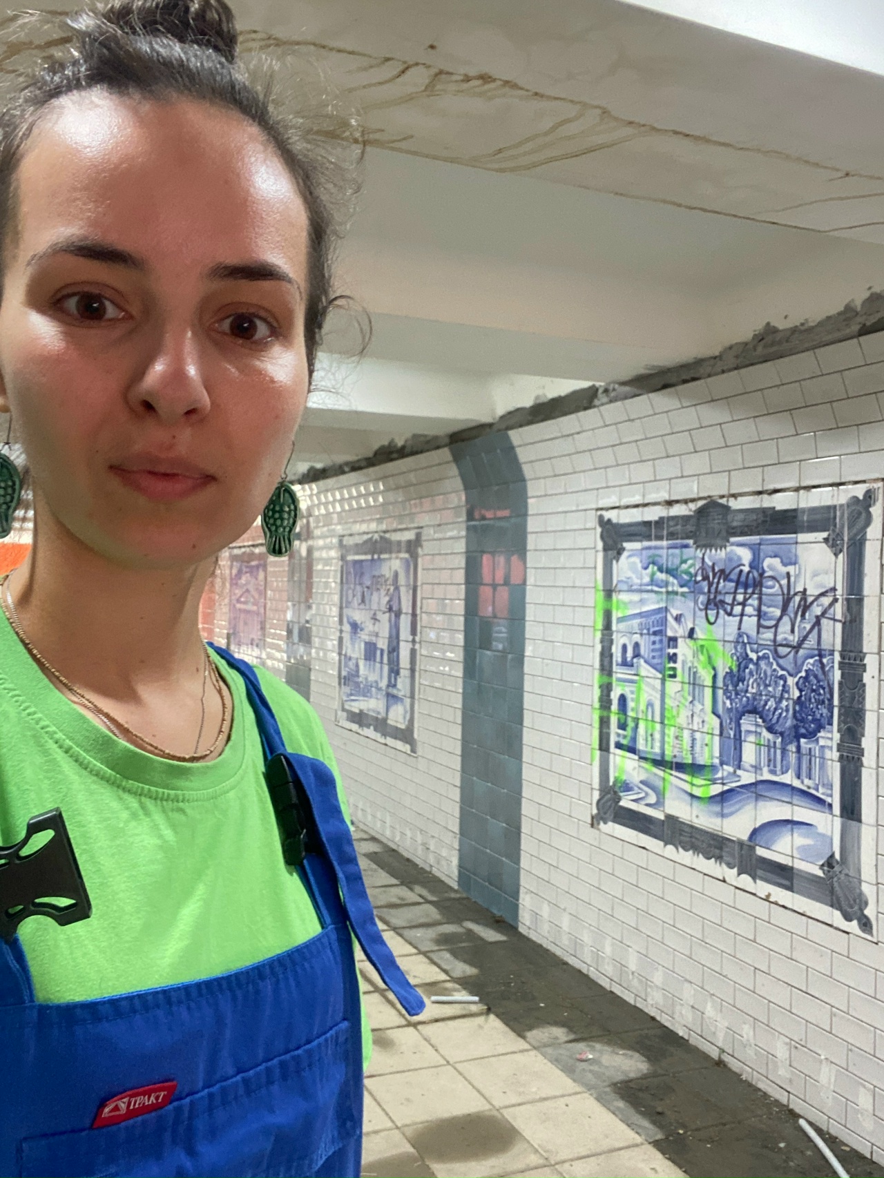 «Отреставрировала 12 панно в подземном переходе у «Барса»» в Рязани. 12 штук! В кратчайшие сроки! Было очень тяжело, но все получилось. Большие панно нарисованы на кафельных плитках методом надглазурной росписи. На панно было много отверстий от шурупов и саморезов, а также очень много сколов и надписей красками. Утраченные надо было нарисовать заново. Поврежденные – отреставрировать на месте. Новых плиток я нарисовала 13 штук, в том числе портреты Ивана Павлова и Владимира Ленина.