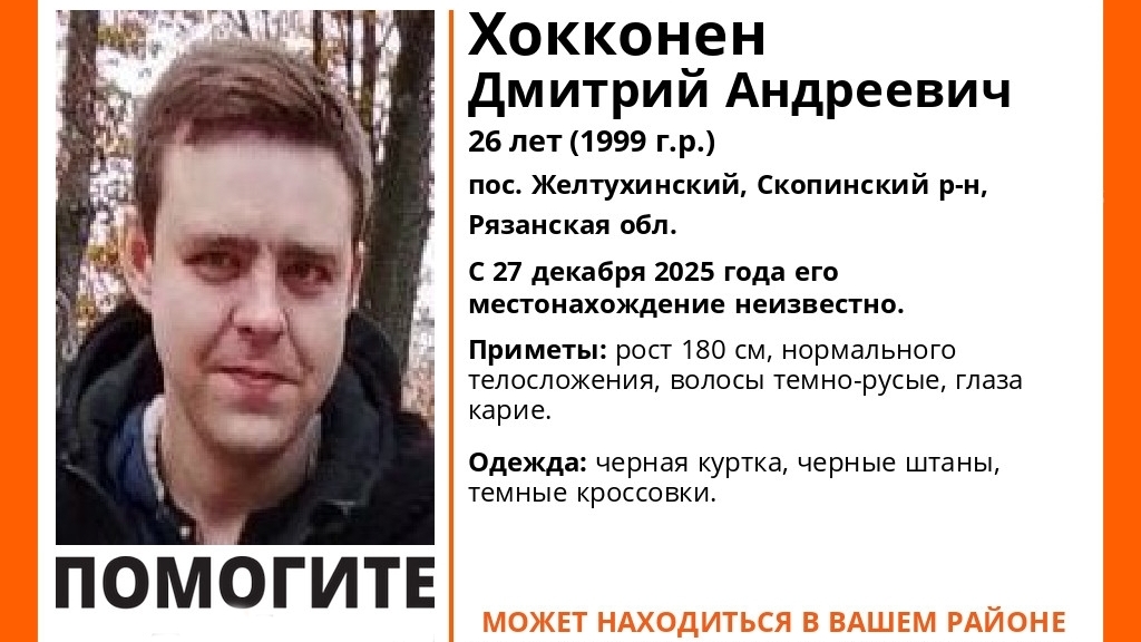 Поисковики ищут 26-летнего жителя поселка Желтухинский Скопинского района. Дмитрий Андреевич Хокконен 1999 года рождения пропал 27 декабря 2025 года, и до сих пор его местонахождение неизвестно.